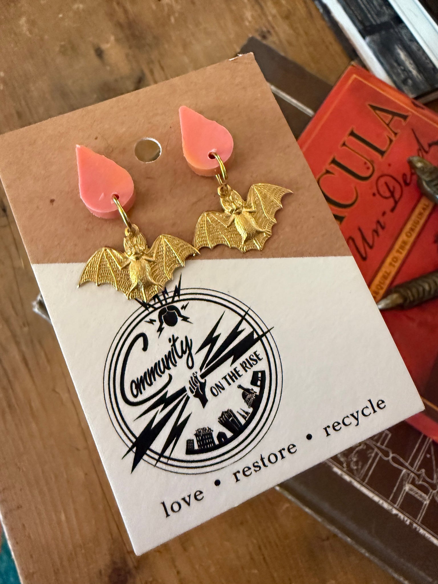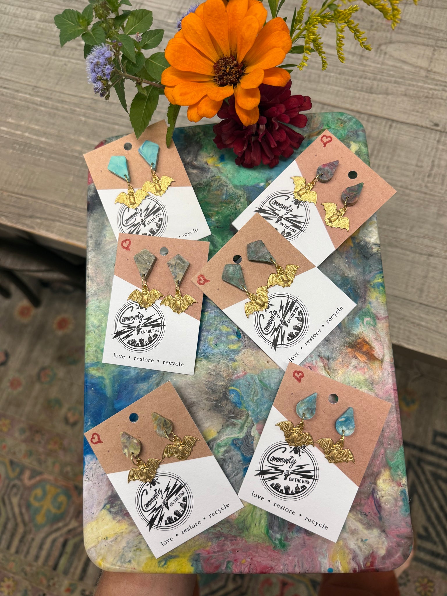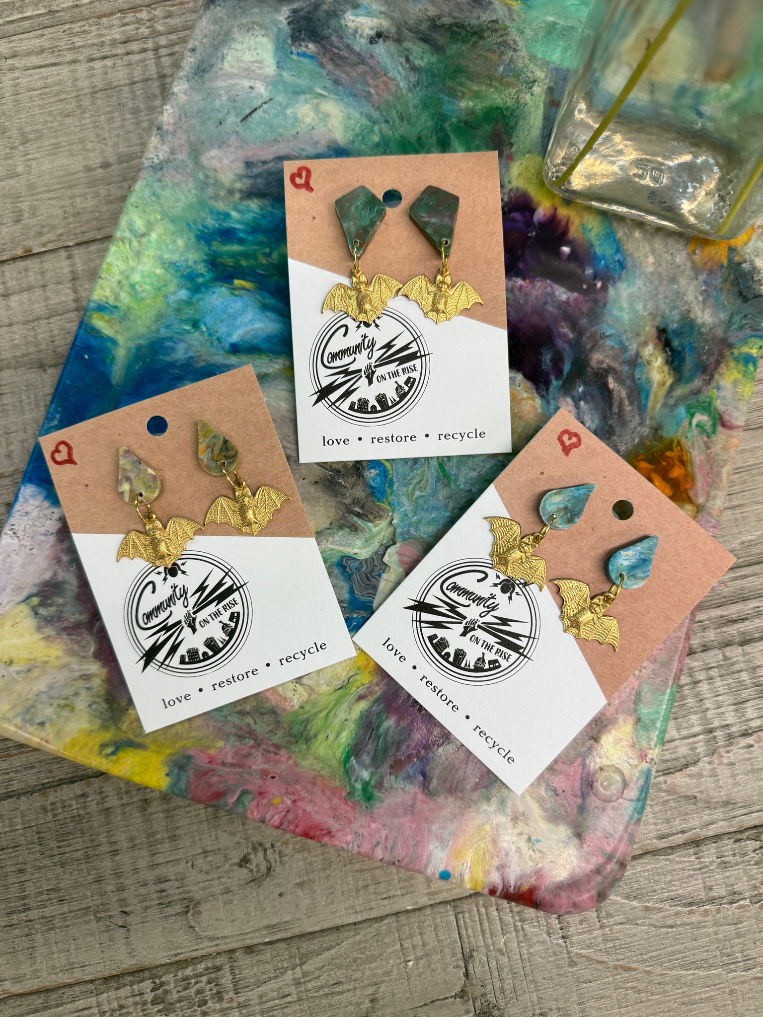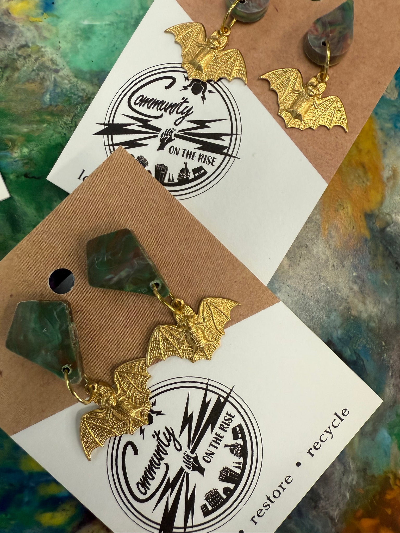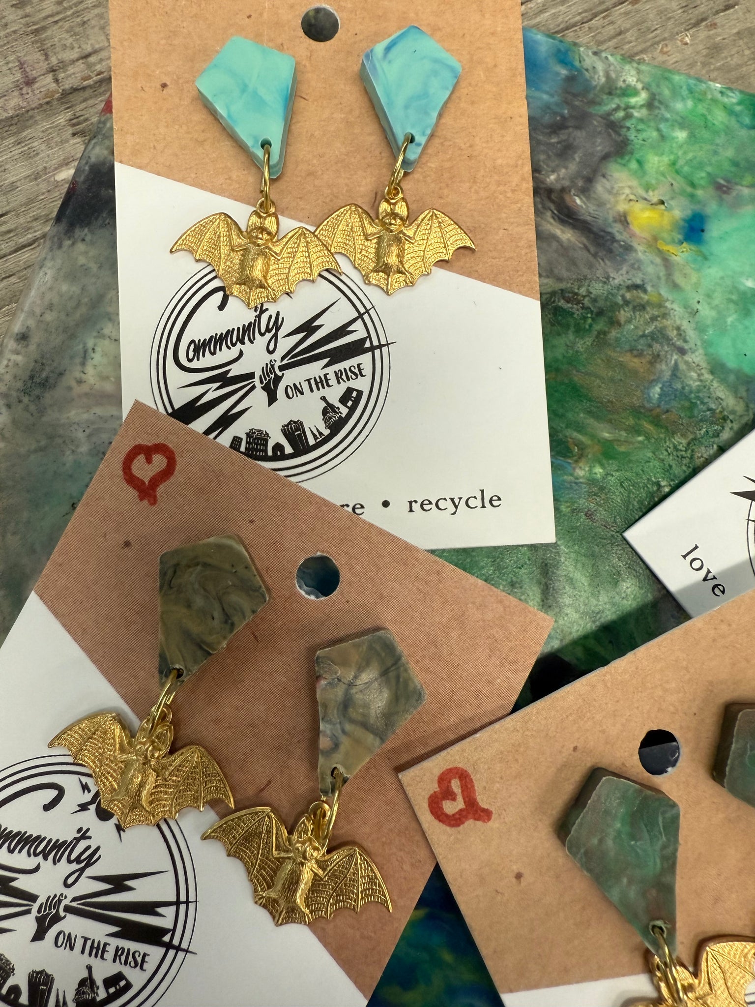 Your favorite new woodland, moonlit, Halloween-esque accessory is here: Birmingham Bats earrings! Our bats are brass, dangling from recycled plastic stones in rather gem or teardrop shapes. Choose your color. Be sustainable, stylish, and spirited!